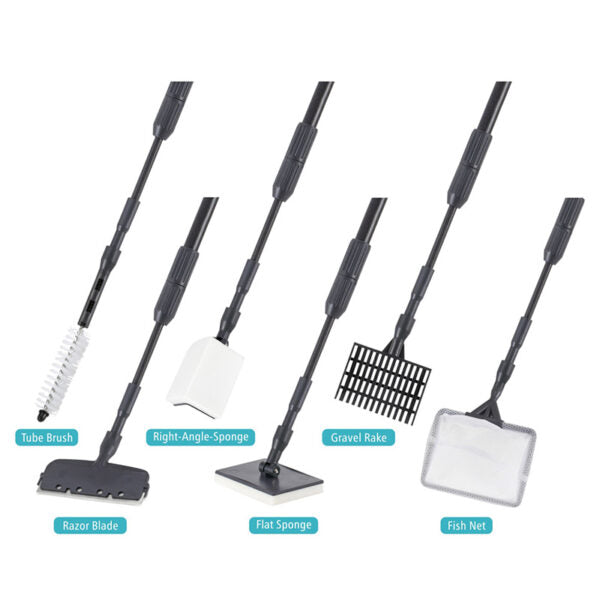 2. The aquarium cleaning tool kit includes 1 telescoping handle, 1 gravel rake, 1 metal blade, 1 flat sponge cleaner, 1 right-angle sponge, 1 tube brush, and 1 fishnet