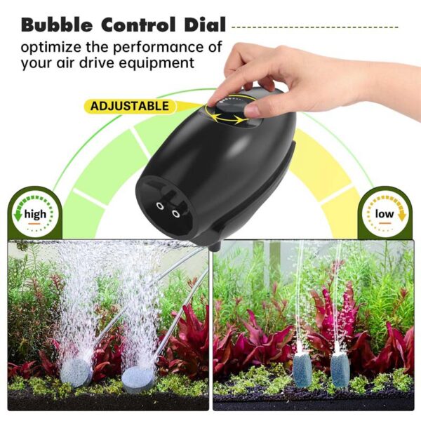 You can easily adjust airflow via a built-in flow control dial to optimize the performance of air pump drive equipment, appliances, or ornaments, to suit different aquatic pets’ needs. You can have tiny fast bubbles or medium, less forceful. The pump is easy to install and use.